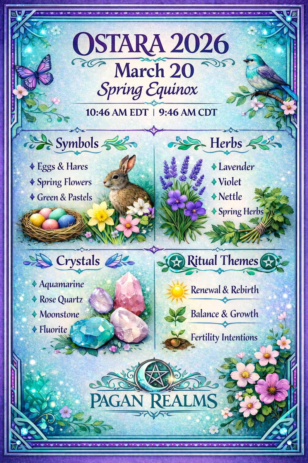 We have the potential to create whatever we desire, and this possibility is strengthened when we align our intentions with the seasons, hope, and harmony. Tools such as spring colors, stones, herbs, seeds, eggs, and candles help us focus our intentions and connect with the universal energy of the God and Goddess, empowering us to shape our reality.