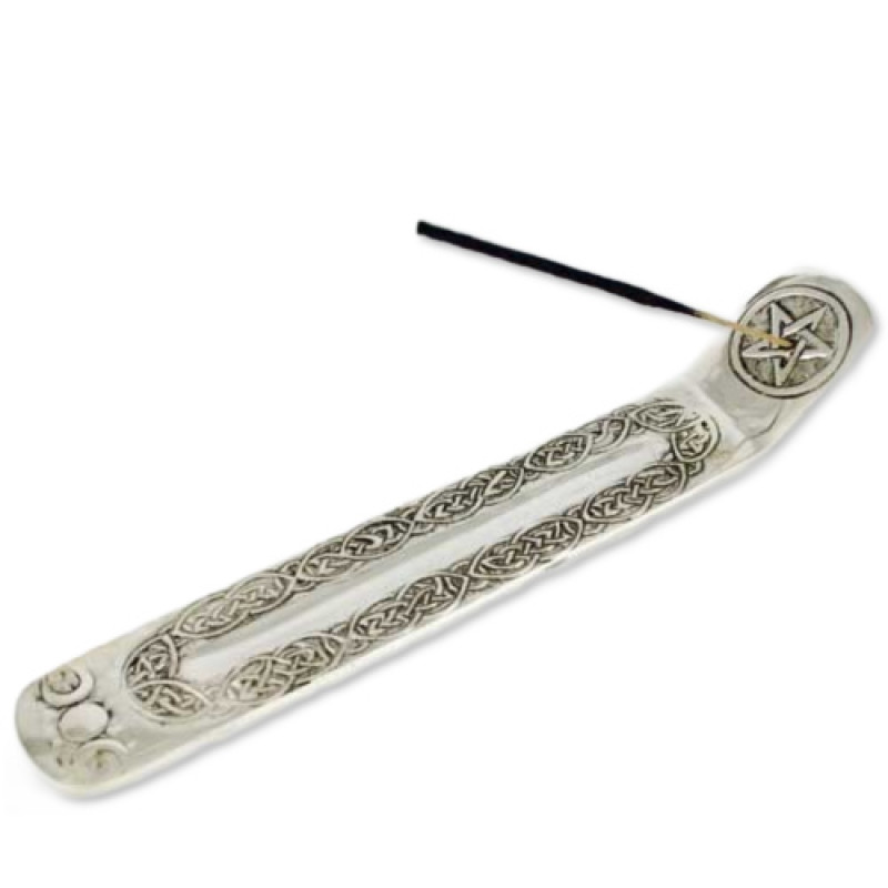This ash catcher depicts an interwoven pentagram where your stick incense is held, with an ash tray decorated with Celtic knots and the Goddess’s triple moon.