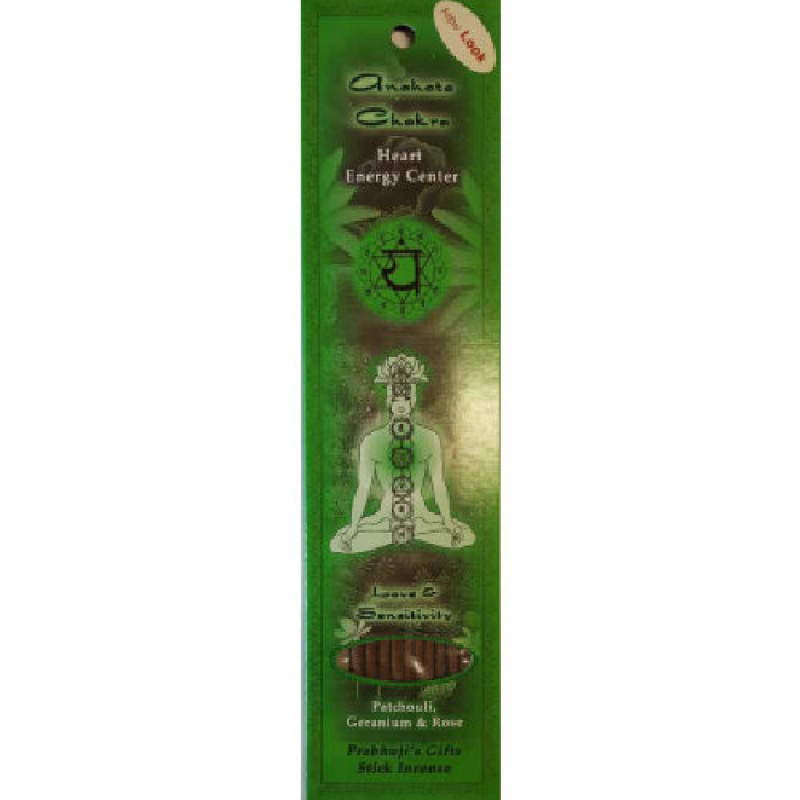 Anahata Chakra: Using ancient wisdom, this hand-rolled stick incense blends together patchouli, geranium and rose in a unique mixture that helps to balance the Anahata Chakra, the fourth energetic center situated near the heart. Continued use of this incense assists in increasing love and sensitivity toward others. This chakra connects us with the element of air. Prabhuji explains that this chakra is related to security in relationships, sensitivity, sympathy, confidence, love towards oneself and others, kindness, helpfulness, flexibility, health, equilibrium, vital rhythm, optimism, enthusiasm, passion, inner peace and harmony. When this chakra functions well, the health of the respiratory system also benefits.