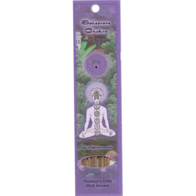 Sahasrara Chakra: This unique blend of the finest fragrances features the sacred and revered lotus blossom. Following an ancient wisdom that has been passed down for countless generations, this hand blended and rolled stick incense is designed to open, stimulate and balance the Sahasrara Chakra. Continued use of this resin incense promotes enlightenment, a balanced personality, the ability to concentrate, intuition and spiritual vision. The Sahasrara Chakra is the seventh energetic center and is situated at the crown of the head. It connects us to the transcendental, to the Divine. Prabhuji explains that when this center functions in a balanced manner, the human being can experience the most elevated level of development in all aspects. This includes a pure and fresh mind, plenitude, interest in religion and spiritual topics, and an attraction to divine consciousness or the call of God.