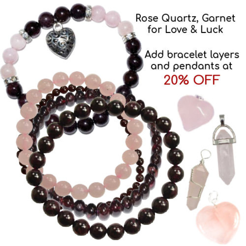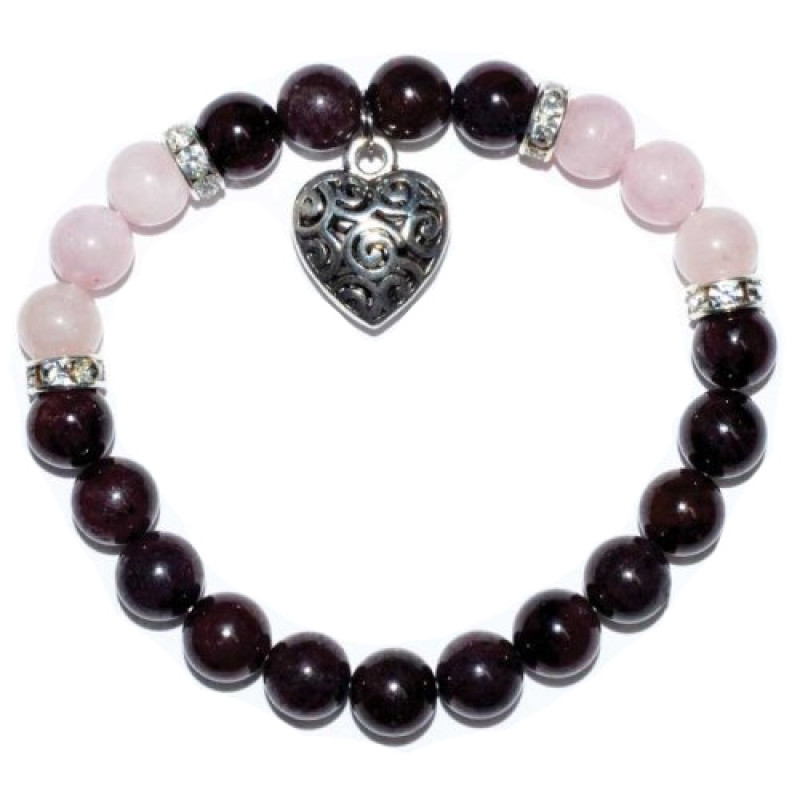 Love will flow in wearing this heart opening bracelet. Garnet is a sensual stone that will bring you luck, while Rose Quartz will send loving energy through you. 8mm beaded bracelet with a heart charm.