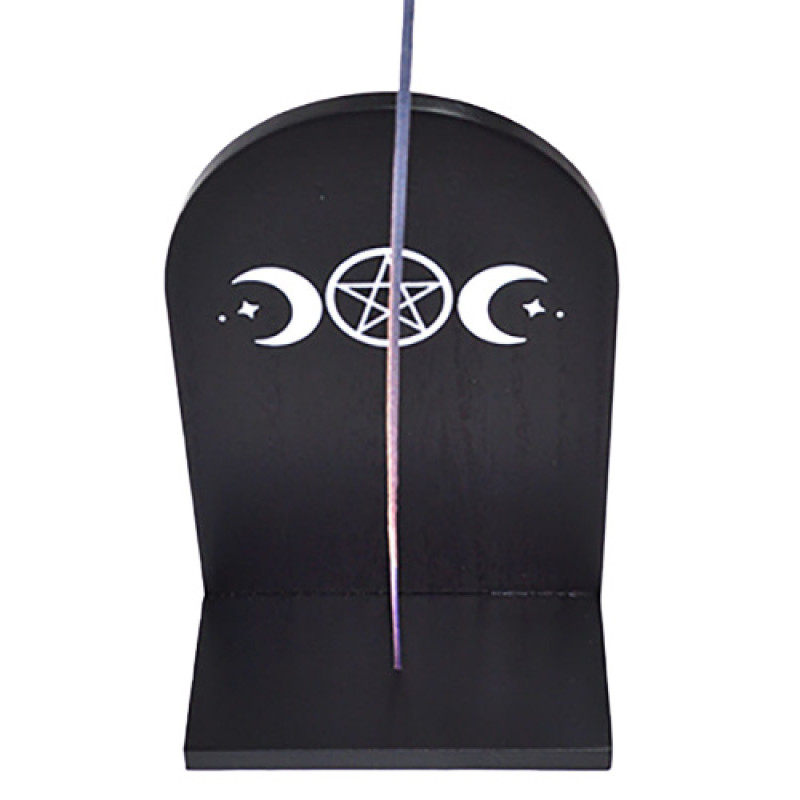 This solid black incense burner can be displayed on a wall or placed on any surface to suit your space. The front features a bold triple moon pentagram design, symbolizing protection, intuition, and spiritual balance. Crafted for both function and style, it holds stick incense securely while adding a touch of mystical energy to your altar, meditation space, or home decor. Incense not included