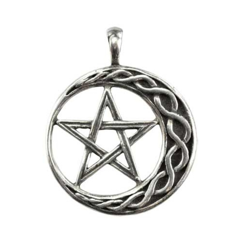 Wear this amulet of a braided crescent moon and interwoven pentagram, to find strength and stability within you and without. Made in USA. Has cord. Pewter. 1 1/4”